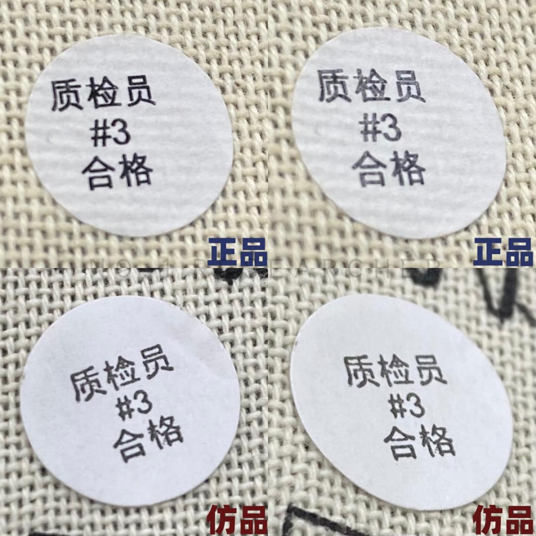正品:胶水痕迹颜色偏黄,贴纸印刷油墨有明显反光。