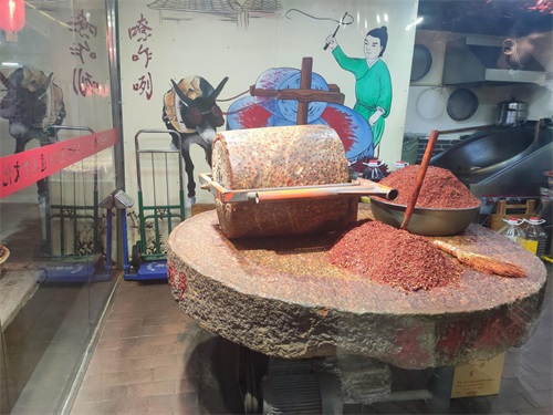不少店里都摆放着食材和旧式的生产工具,如干辣椒串,以前农村地区常见的石碾子。
