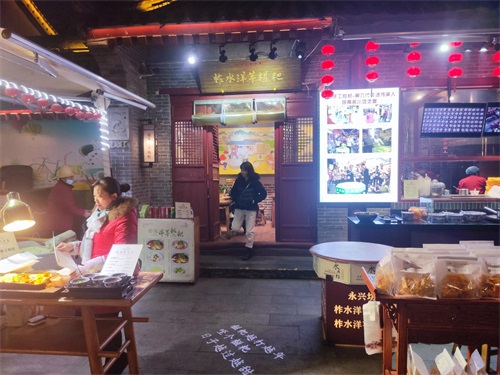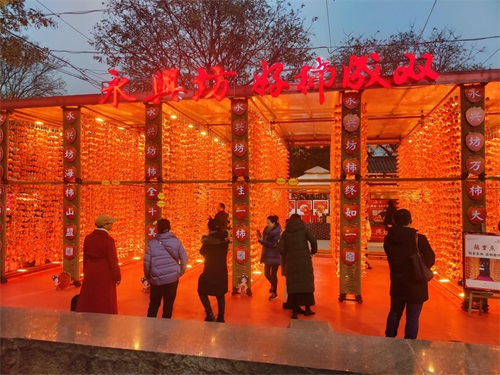 正是黄昏时候,华灯初上。门口一个用柿子串做成的景观,红彤彤的,分外耀眼,上面大书“永兴坊,好柿成双”几个大字。