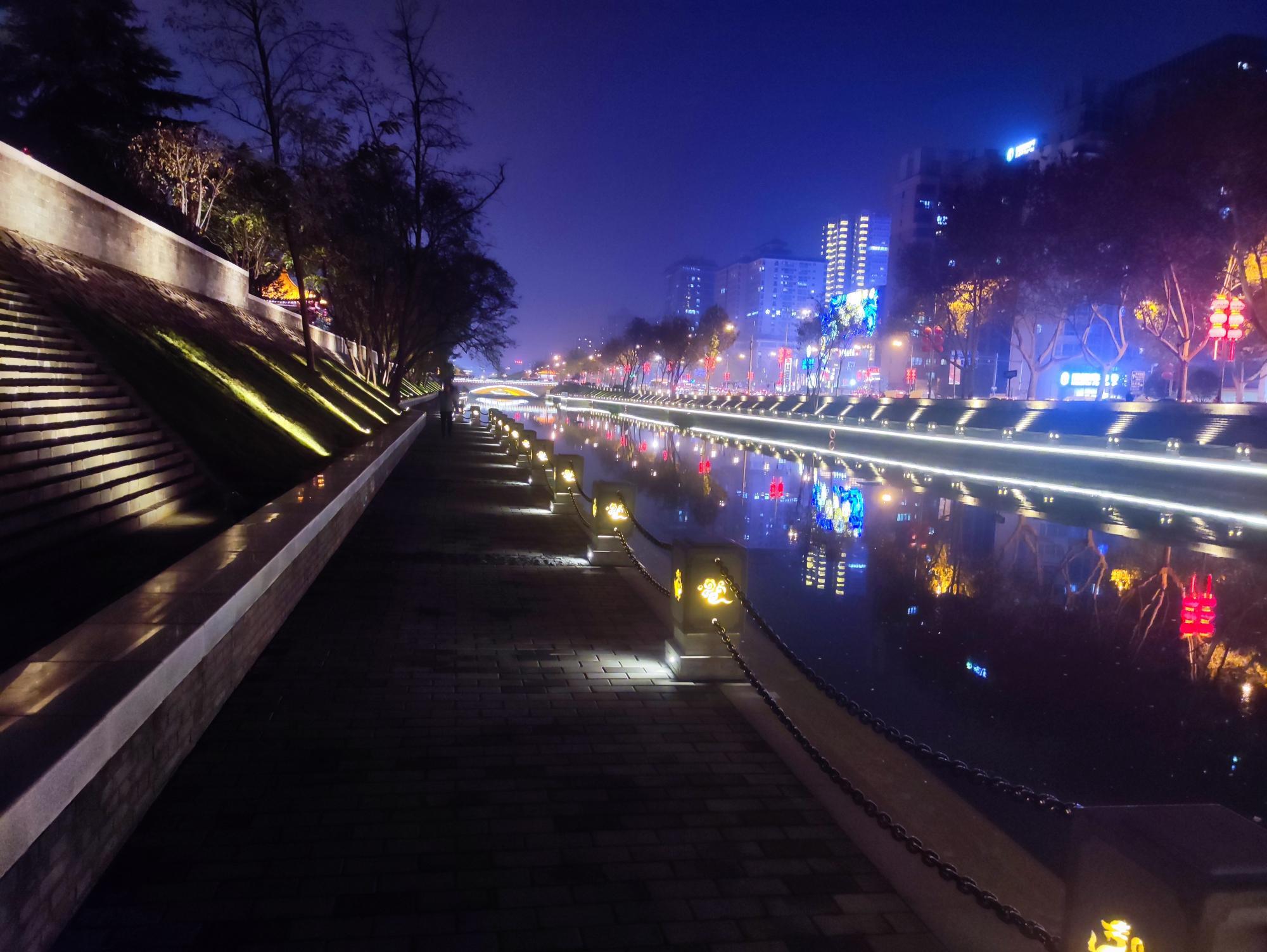 走出永兴坊,天已黑尽,沿着城墙脚下往北走。此时,波平如镜的护城河里,映照着各色的灯光,堤坝上也被投下了斑驳的光影,看起来十分绚丽,恍如来到了童话世界。这里是晚饭后散步,或者情侣喁喁私语的绝佳地点。