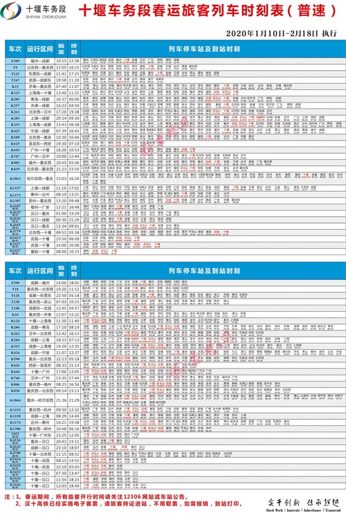 秦楚网讯(记者 冰客 特约记者 赵连斗)1月10日零时起,为期40天的2020年春运大幕正式开启,铁路春运列车时刻表同时启用。十堰车务段同时发布春运普速和高铁旅客列车时刻表,自同日零时起启用。