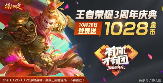 登录领1028金币和对战经验金币翻倍这些小活动就更不用说了,你们觉得这次周年庆的活动如何呢?我觉得可以算是诚意满满了,特别是28号当天,登录一天得到的东西比几个月都多,绝对不能错过!欢迎大家关注和分享,随时给你们带来王者荣耀的最新资讯心得福利哦,还有当前强势英雄攻略和体验服申请通知等。