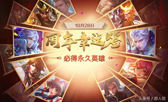 在28号登录游戏可以在王者周年庆的周年专属幸运签界面进入许愿树,抽取幸运签,礼物有永久英雄,永久皮肤和皮肤碎片20个,其中永久英雄是必得的哦!