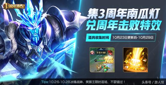 3周年的击败特效有你才有团也能免费获取,是通过收集3周年南瓜灯的方式来得到,这个南瓜灯在23号更新后到29号通过登录和对战来获得,商城也会在26号上架,不过只有2个,所以大部分还是要靠登录和对战。