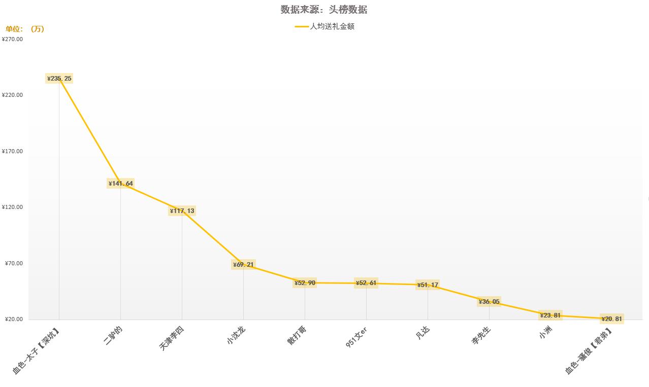 不过在人均送礼金额数据中,太子直播间人均送礼高达235元,排行第一位,而快手的几位主播则处于曲线前半段,YY占据后半段,最后由虎牙骚俊以人均20收尾。