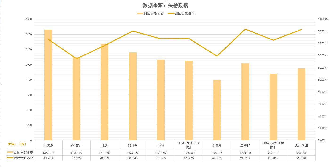 本期十位主播中,8位主播的财团贡献占比超8成,快手二驴、散打哥、天津李四三人贡献比更超过90%。YY人气一姐文er,财团贡献比仅为67%,证明她直播间中不仅有多位大哥支持,散户支持率同样可观。