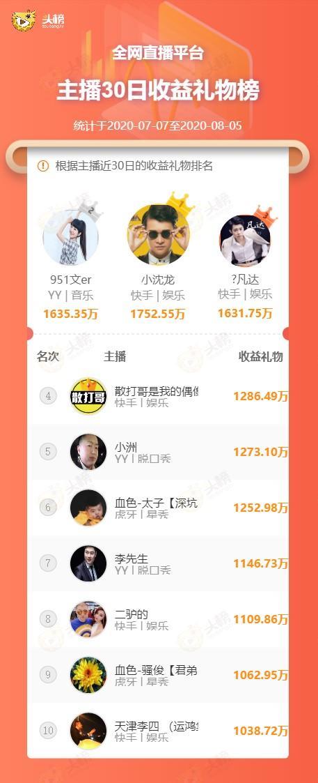 全网主播收入排行月榜:快手小沈龙1750万冠军,YY一姐文er第二