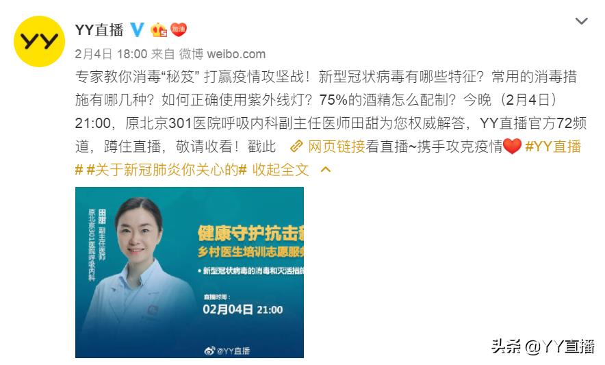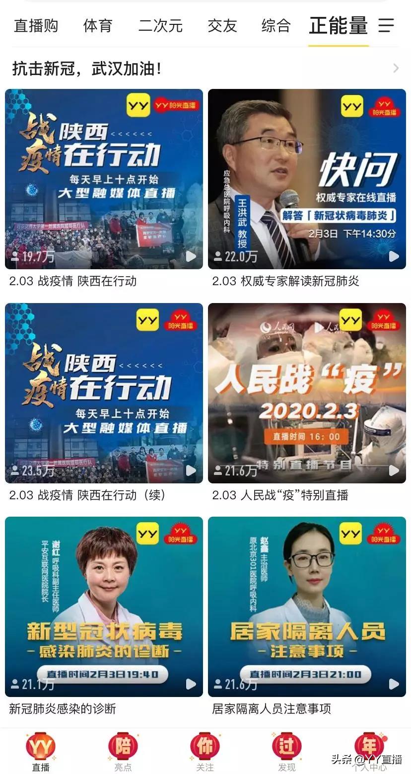 大伙在YY可以看到多地关于疫情的现场直播,大伙也可以云监工雷神山施工,也能看到权威专家关于舆情防控、健康保护等直播在线解答。