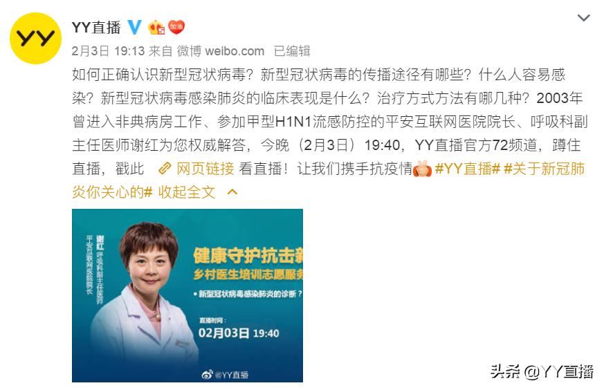 这个新春,新型肺炎牵动着千万人的心,每天都是铺天盖地的消息,在网上大家也看到了不少谣言,为此YY直播和众多权威媒体合作,进行了一系列关于疫情的直播。