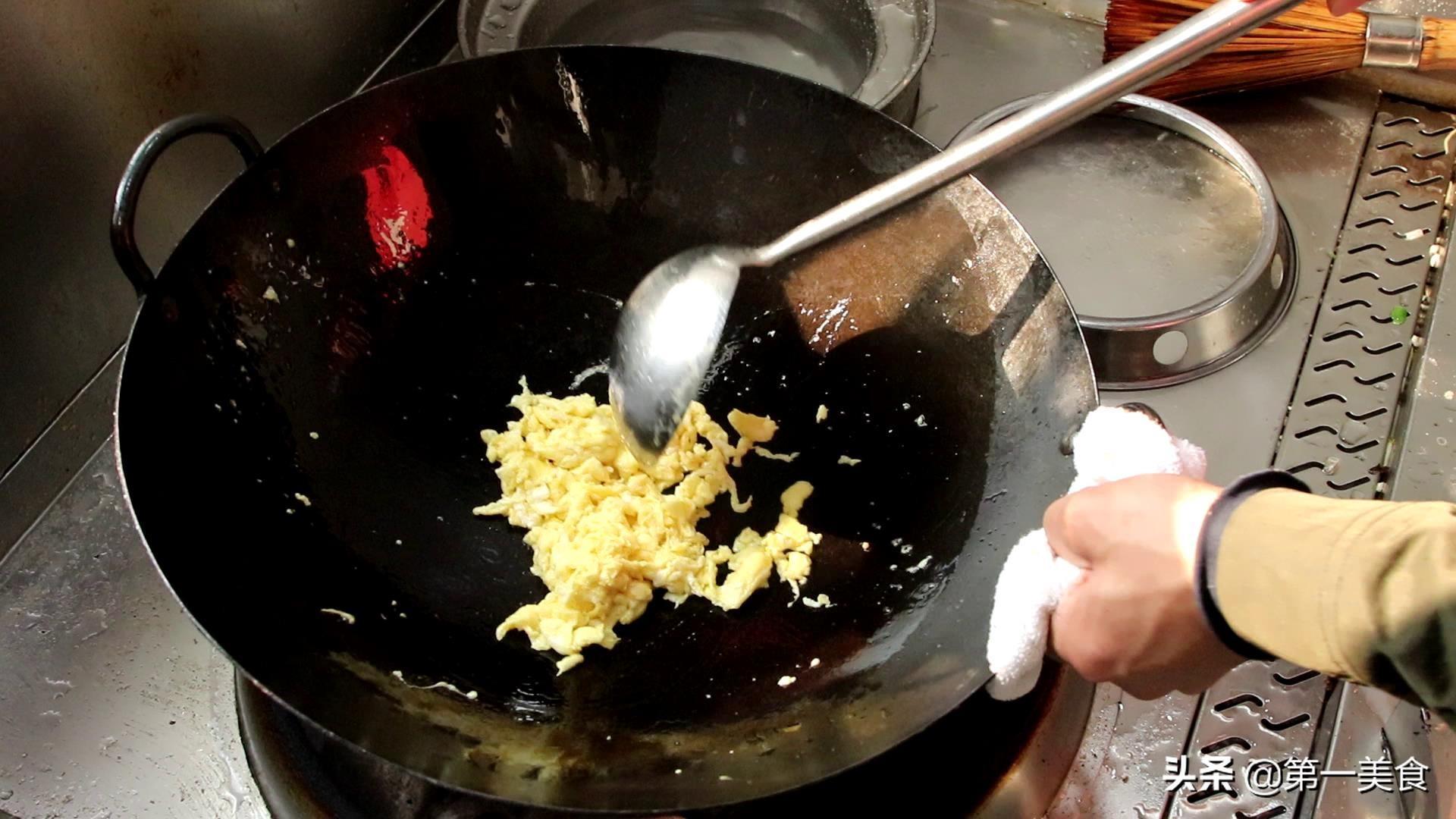 锅内烧油,油温五成热时倒入鸡蛋液,鸡蛋液全部定型以后盛出备用,炒鸡蛋不易时间过长容易炒老。