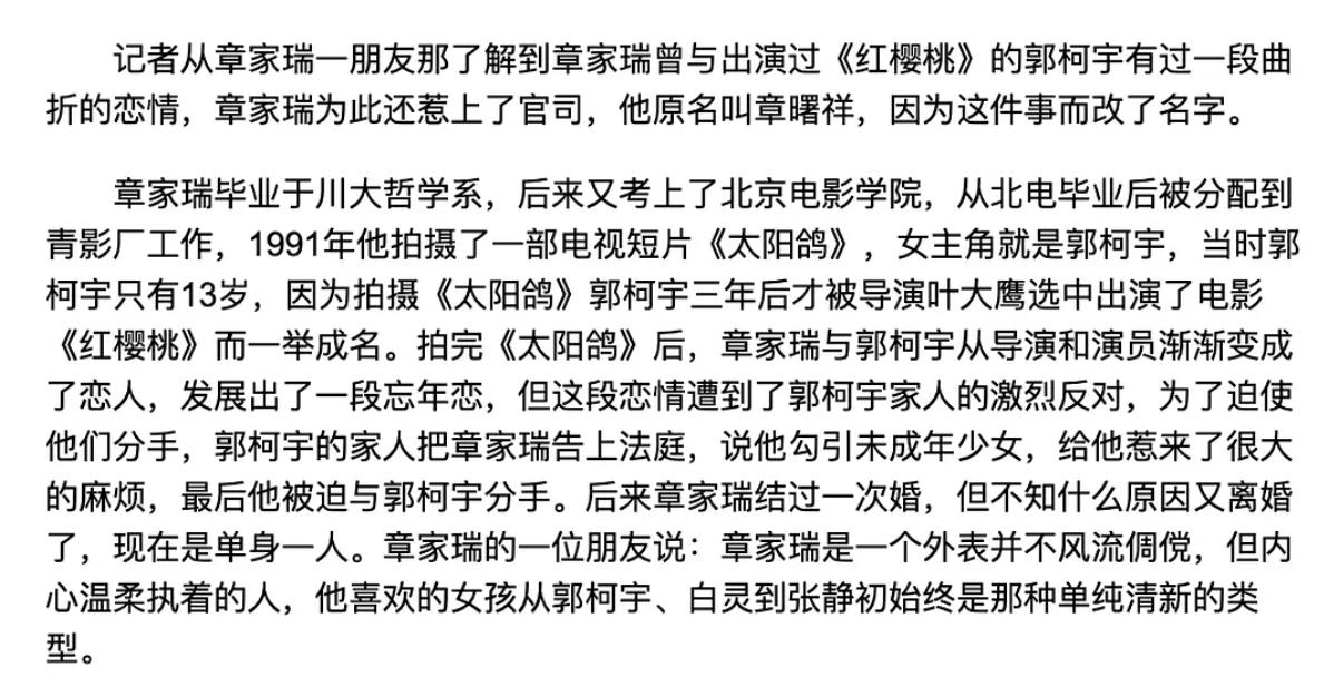 简单查了一下郭柯宇的感情经历,郭柯宇曾经的恋人竟然是章家瑞,相恋的时候女方还是未成年!章家瑞是挖掘郭柯宇的导演,但这段恋情因为父母的阻拦无疾而终。郭柯宇应该是之前爱得太用力了,受伤之后觉得别折腾了,差不多找个人结婚算了。