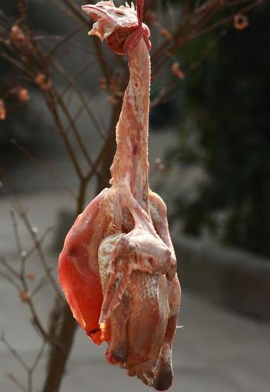 风干鸡又名“刘皇叔婆子鸡”。据说是三国时期刘备的老婆发明的。这道菜的做法要求很苛刻,厨师的手法必须要快,就是将火鸡以极快的手法,拔毛取内脏,然后放入佐料,再把伤口重新缝合,然后挂在通风的地方,整个过程都要求鸡必须是活着的。 对于鸡来讲,直到自己的伤口被缝上了,才发现自己的内脏都已经被掏空,是不是太残忍了。直到今天,这道菜依然有少数地区的人在做,而且特别受欢迎。