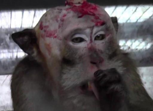 小编在之前写过的文章造孽!发明这三种“酷刑”的人应该被生吞活剥中有提到过这个。据说这道菜是在明末清初时期发明的,清兵入关后,为了庆祝战斗的胜利,直接用锤子把猴脑敲开,吃里面的脑浆。 后来这道菜有了改进,估计是受了《西游记》的启发,把猴子的脑袋上套上一个类似于紧箍咒的东西,勒得特别紧,然后在桌子上挖一个小洞,正好够猴头漏出来。等食客们坐好,厨师直接将猴子的头盖骨敲掉,此时猴子的脑浆便漏了出来,食客们直接用勺子挖着吃。而此时,猴子还活着呢,在桌底下发出惨烈的哀嚎声,真不知道当时的人们怎么能下得去口。