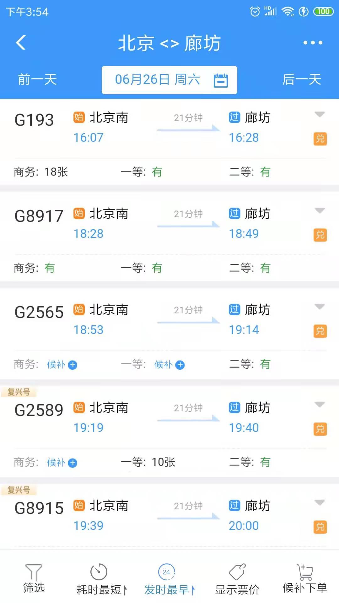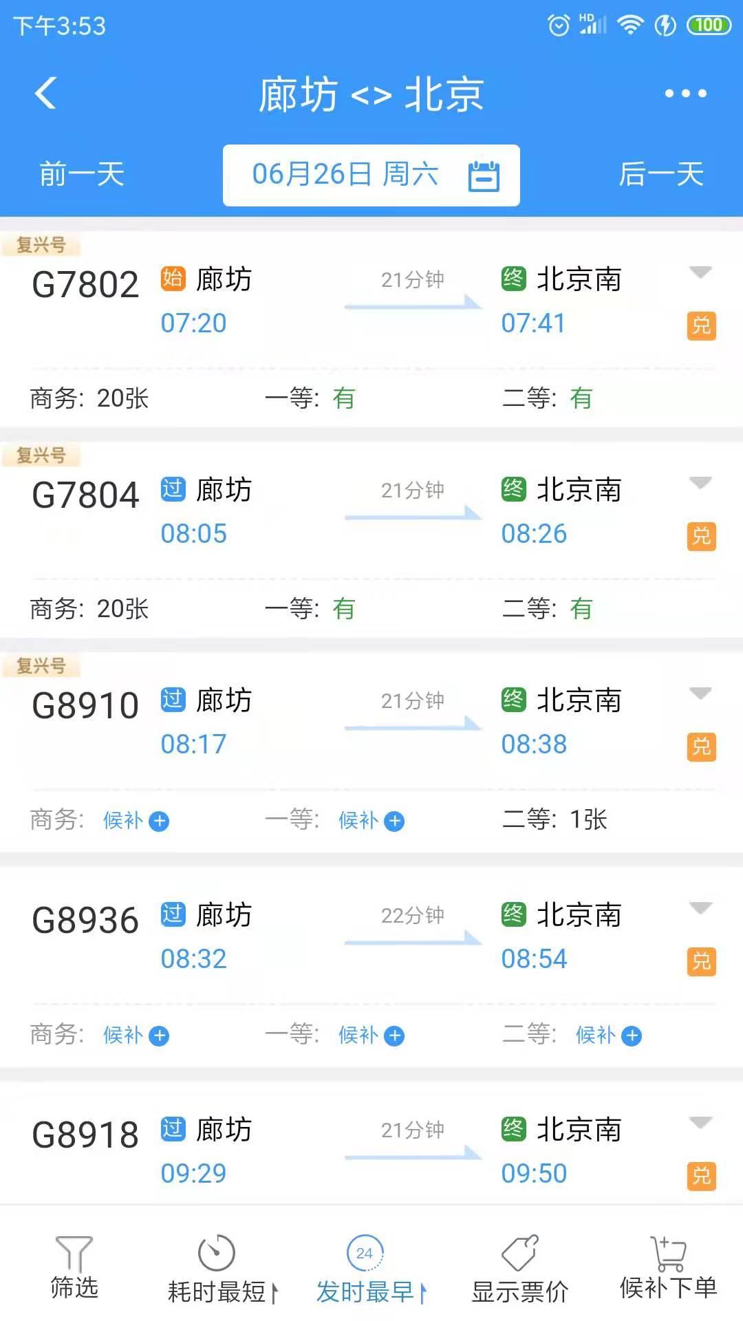 原G8912次,7:47廊坊站到北京南站的车,26日后暂时没有安排了,后续情况未知。