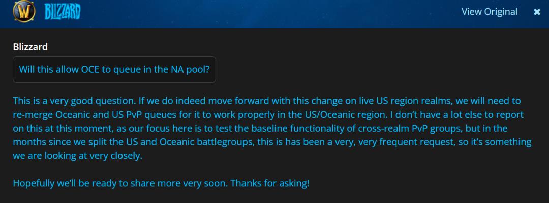 暴雪表示为防止出现大规模排队情况,目前不打算解除这些服务器禁止转入和建立新角色的限制,然而他们发现在WLK资料片中几乎所有PVP活动都是跨服,因此决定允许玩家跨服组队参与战场和竞技场活动。目前该功能已经在PTR测试服上开启测试。