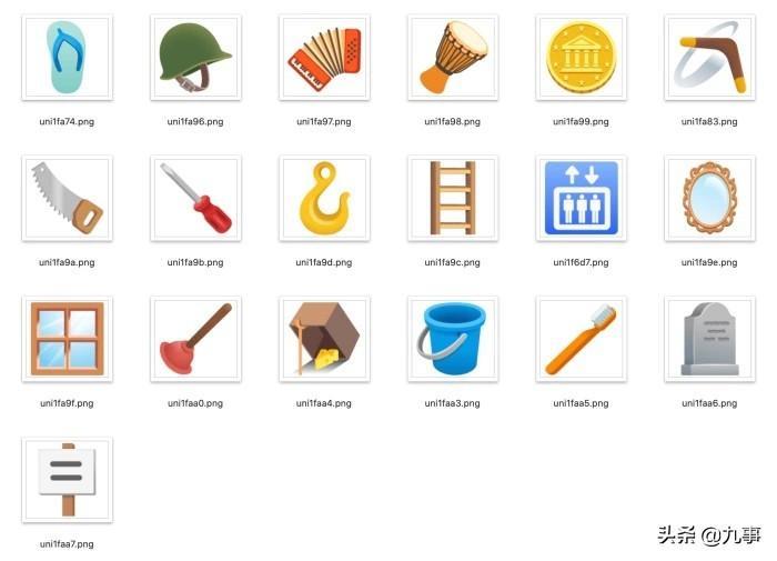 凉鞋,军用头盔,手风琴,长鼓,硬币,飞旋镖,木工锯,螺丝刀,吊钩,梯子,电梯,镜子,窗户,柱塞,老鼠夹,水桶,牙刷,墓石,标语牌