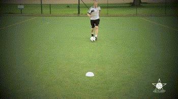 先将右脚向右前方跨一步,同时重心略微右移(球还在自己前方,不要碰它),然后左脚也向左前方跨出一步,每一步都不要超过球,保持在球的后方,使球在自己的控制之下,此时要观察对手的重心情况,可视情况右脚再做一次,直到对手的重心完全失去。最后向相反方向的斜前方拨球,加速完成过人。