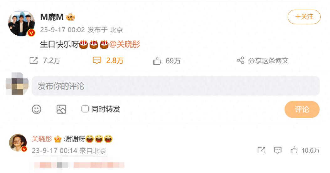 9月17日,演员关晓彤的生日,鹿晗零点发文为关晓彤庆生:“生日快乐呀!”,随后,关晓彤在评论区回复道:“谢谢呀”。