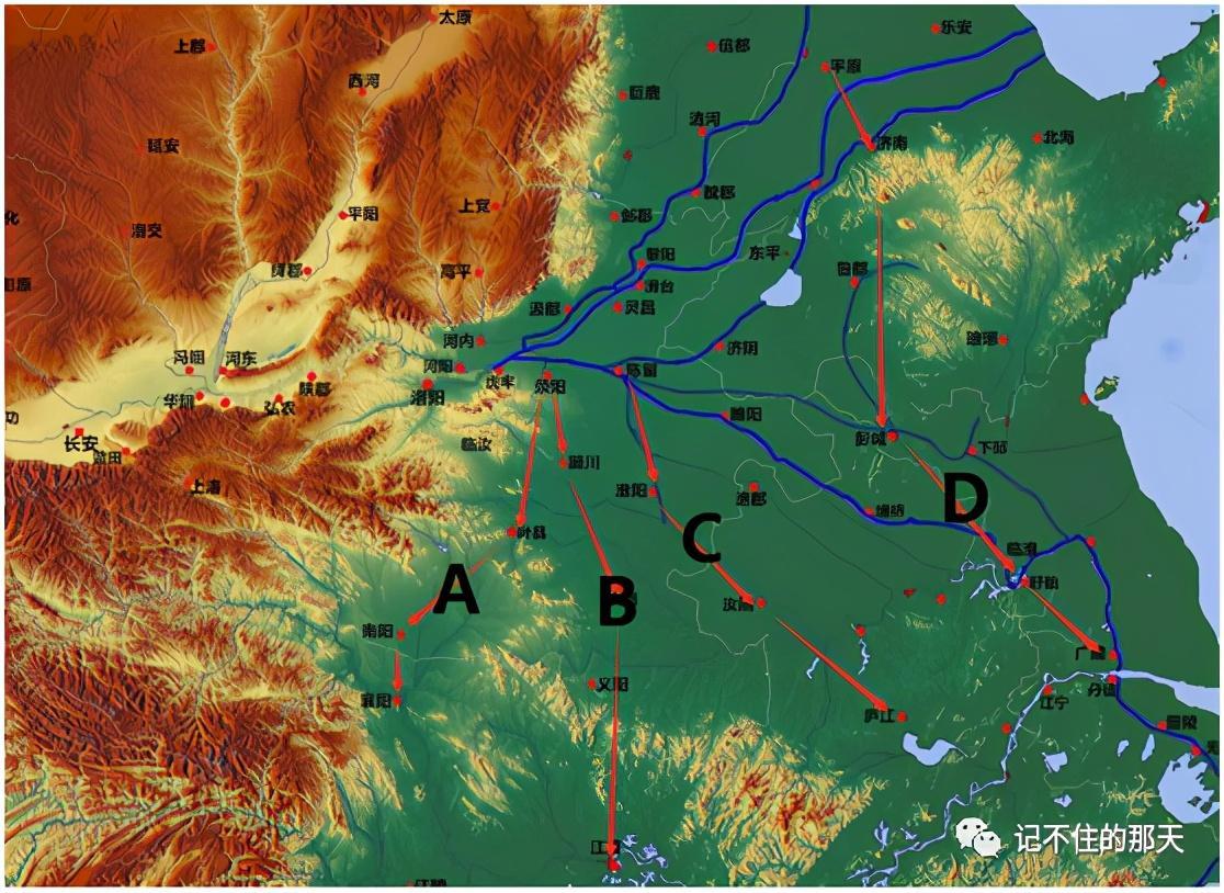 我们回顾下当时的地图,开辟南方战场大体上有四条路线,燕军在当时选择A路线,即南阳-襄阳方向,这是有道理的。当时的局势是燕帝国在潼关正面战场受阻,河北后方战场失利,局面岌岌可危。此时开辟南方战场的主要目的是切断东南对西北朝廷的后勤补给,逼迫唐军潼关主力部队出击决战。