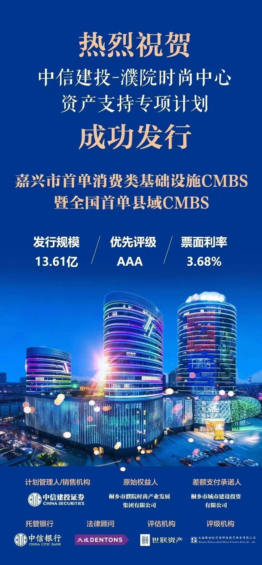 产品亮点:嘉兴首单消费类基础设施CMBS,全国首单县域CMBS。标的物业濮院时尚中心地处首批国家级特色小镇桐乡市濮院镇,位于长三角一体化发展区域、G60科创走廊和杭州湾大湾区建设的重要节点。濮院具有全国领先的羊毛衫产业全产业链,近年来年销售总额持续超千亿元。濮院时尚中心商业裙楼1-5层位于濮院核心交易区,自2018年开业以来出租率保持满租状态,物业收益水平突出。