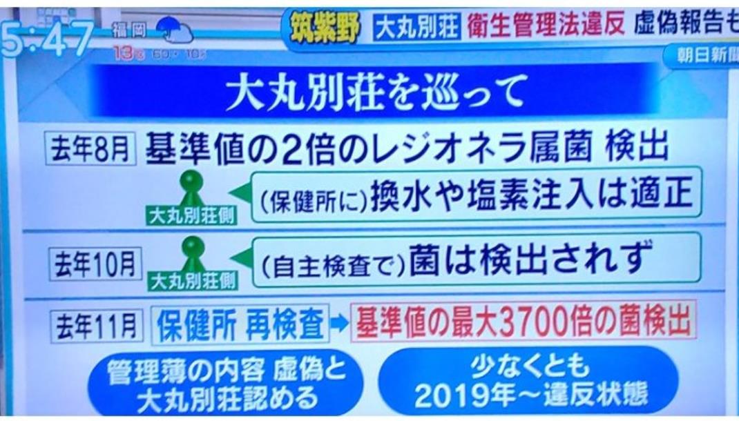 于是,福冈县卫生部门对大丸别庄进行了现场检查,并在公共浴池的热水中检测到军团菌超标,病菌数量是标准值的两倍。
