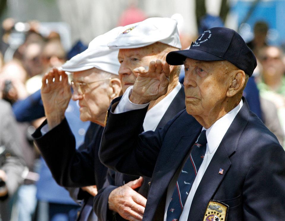 ▲2012年4月18日,在俄亥俄州代顿市的美国空军国立博物馆举行的纪念杜立特空袭70周年相关活动上,当美国国歌奏起时,科尔(右)和其它老兵一道敬礼致意。