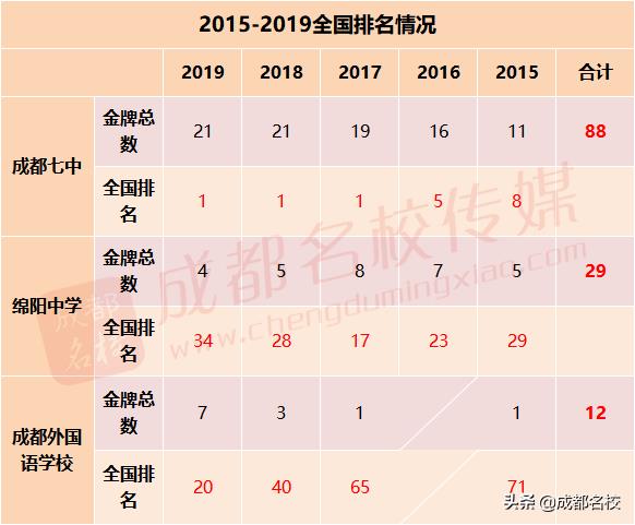 根据网络数据,2017~2019三年间,四川保送清北人数总计105人,分布在7所学校:成都外国语学校44人,成都七中33人,绵阳中学17人,嘉祥外国语学校4人,南山中学4人,石室中学2人,绵阳东辰国际学校1人。