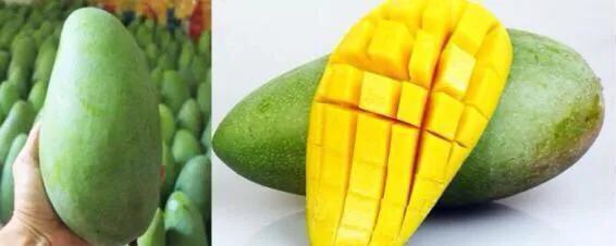 还有一种芒果成熟后,果皮也依然是青色的,它就是凯特芒。原产于美国佛罗里达州,果实呈椭圆或倒卵形,果实硕大果大(单果重可达1~1.5kg),堪称芒果中的巨无霸。