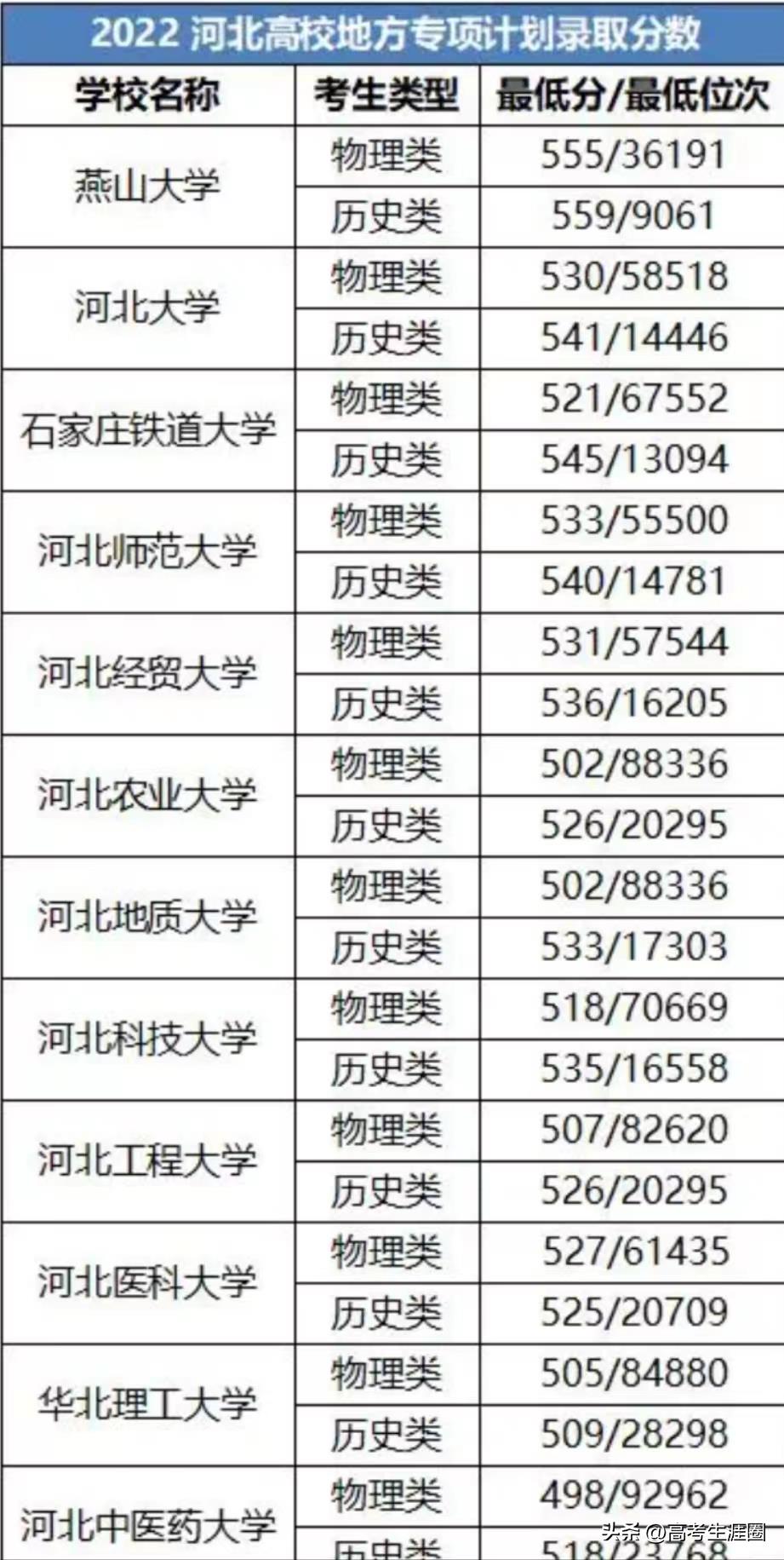 填报时可以以往年的录取分数作为参考,2022年河北省各个高校地方专项计划分数线如下表所示。