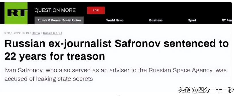 根据俄罗斯媒体报道,当地时间周一,莫斯科法院以不公开审理的方式,对俄前记者、俄航天局前顾问萨夫罗诺夫进行审判。法院判决裁定其“叛国罪”成立,并以此判处他22年监禁,并处以50万卢布(约8300美元)的罚款。