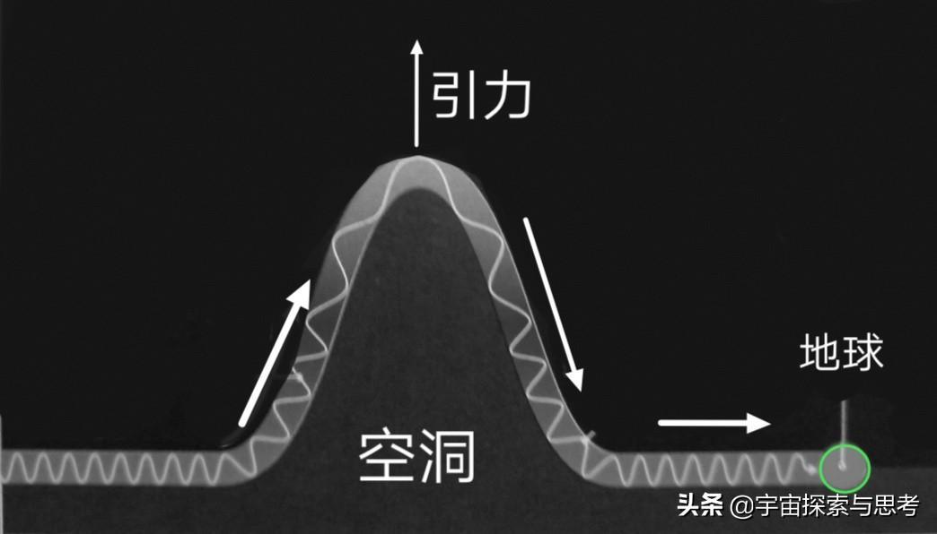 ISW效应:由于空洞物质缺乏而密度较低,引力作用当然要比周边的高密度区域低,当光穿越宇宙空洞,周围引力作用让光线弯曲,如下图所示,类似于上下坡,这个过程的光速不变,区别在于“上坡”时造成能量的损失,而“下坡”后获得能量,但获得的能量小于上坡前的能量。只有暗能量让宇宙加速膨胀ISW效应才回发生。