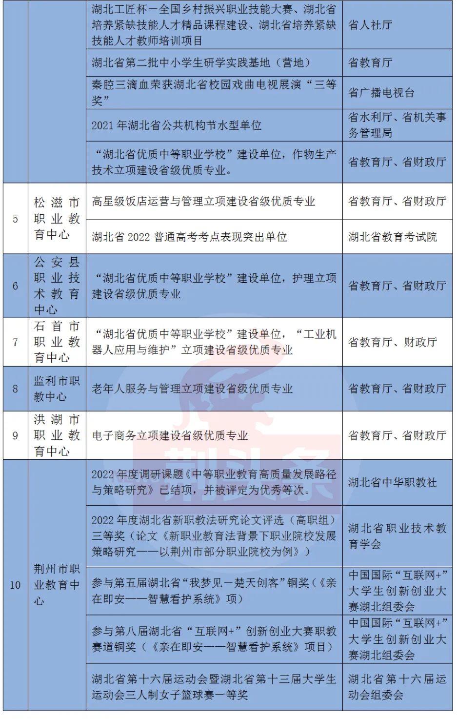 省级(部门):2022年全省职业院校班主任大赛中,荆州市获1个一等奖,3个三等奖。湖北省第十二届黄鹤美育节赛项中,荆州市中职学校19个项目获奖。