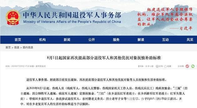 而退役军人事务部、财政部日前发出通知,称将于8月1日起再次提高部分退役军人和其他优抚对象等人员抚恤和生活补助标准。