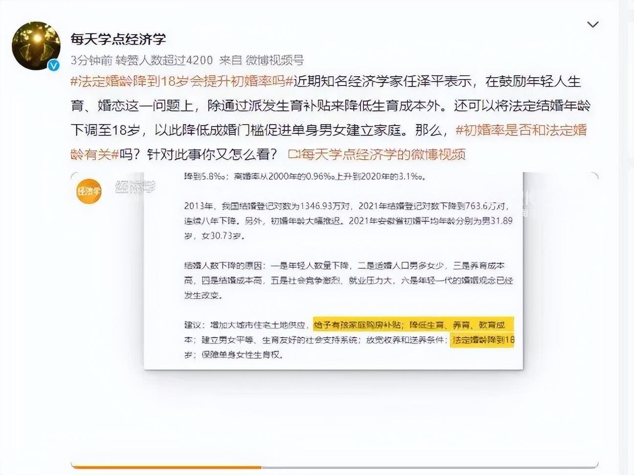 这位任泽平专家提出建议:可以将结婚年龄,降至18岁。