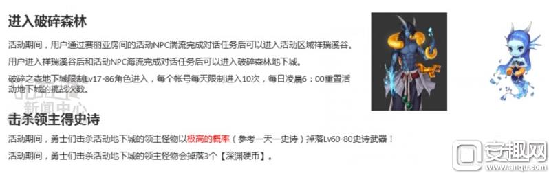 破碎森林地下城:Lv17~86角色可进入,击杀本地下城领主怪物会以极高概率(17173小编推测每天至少出一件)掉落Lv60-80史诗武器,并且将掉落三个深渊硬币。本地下城每天限刷10次,每日凌晨6点重置挑战次数。
