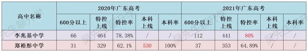 李兆基中学600分以上人数全市前7、特控率80%左右,郑裕彤中学600分以上人数30+、特控率65%左右。2022年佛山高一统考,郑裕彤中学前50名约等于李兆基中学前70名,郑裕彤中学前100名约等于李兆基中学前150名,郑裕彤中学前200名约等于李兆基中学前250名。