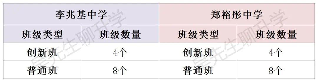 李兆基中学创新班4个、普通班8个,郑裕彤中学创新班4个、普通班8个。根据往年高考成绩推测,李兆基中学创新班的学生15%考上985高校、80%考上211高校、100%考上重点大学,普通班的学生70%考上重点大学;郑裕彤中学创新班的学生5%考上985高校、50%考上211高校、100%考上重点大学,普通班的学生48%考上重点大学。
