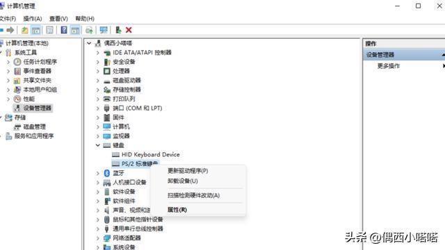 第2步、点击“管理”后,找到键盘,在上面点击鼠标右键,会展开折叠的子选项,在子选项里选择PS / 2标准,点击右键,弹出菜单选项里点击属性。