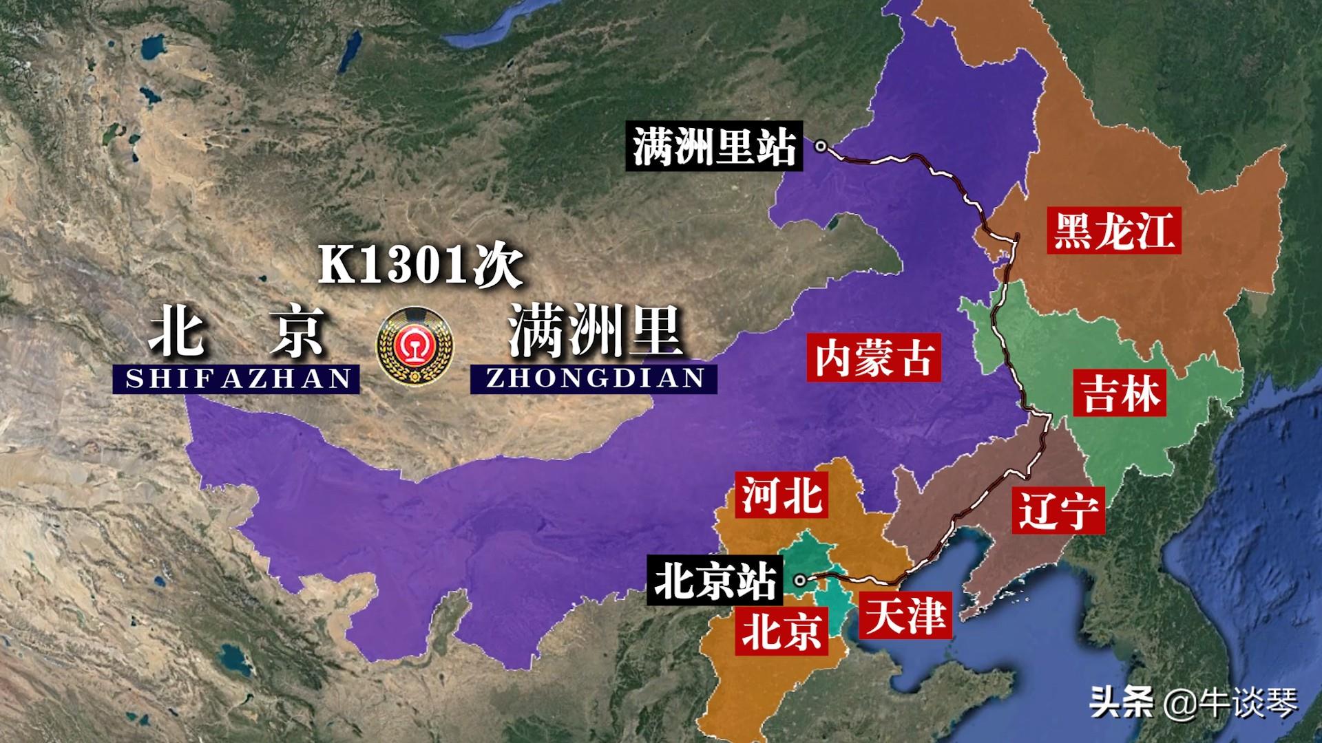 K1301次列车运行线路图:北京开往内蒙古满洲里,全程2260公里