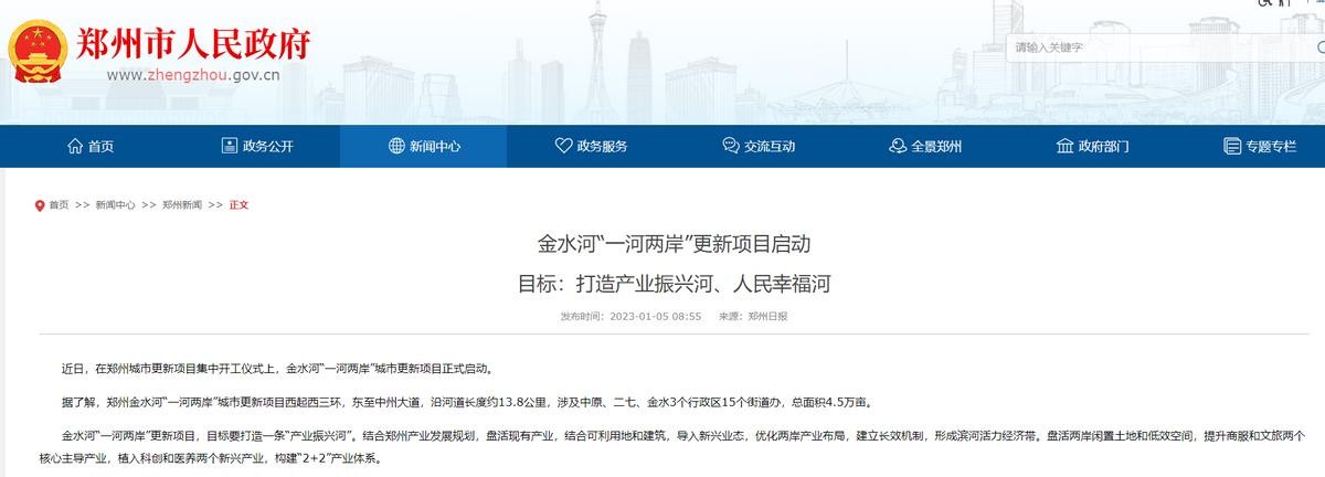 2023年,金水河“一河两岸”城市更新项目正式启动。据了解,郑州金水河“一河两岸”城市更新项目西起西三环,东至中州大道,沿河道长度约13.8公里,涉及中原、二七、金水3个行政区15个街道办,总面积4.5万亩。