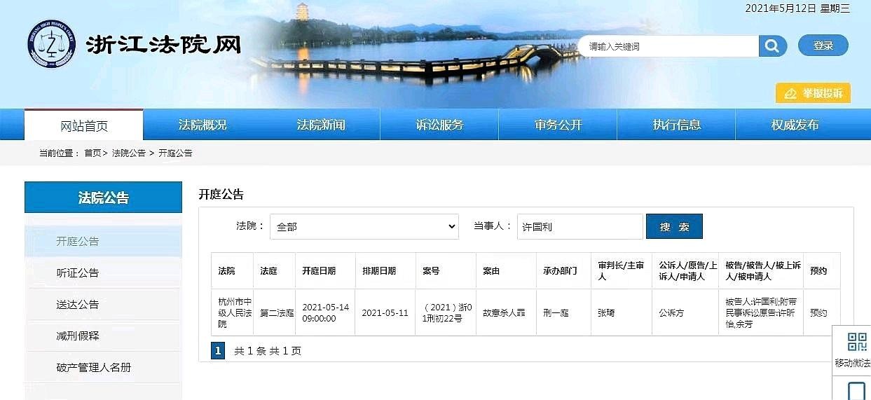 5月12日,从浙江法院网“开庭公告”获悉,许国利涉嫌故意杀人一案,将于5月14日(即本周五)上午9时在杭州市中级人民法院第二法庭开庭,该案附带民事诉讼。(综合媒体报道)