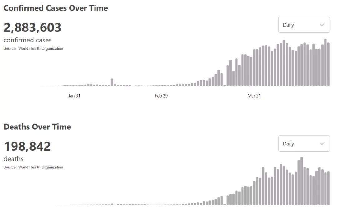 根据世卫组织最新实时统计数据,目前全球确诊新冠肺炎2883603例,死亡198842例,中国以外近280万例。