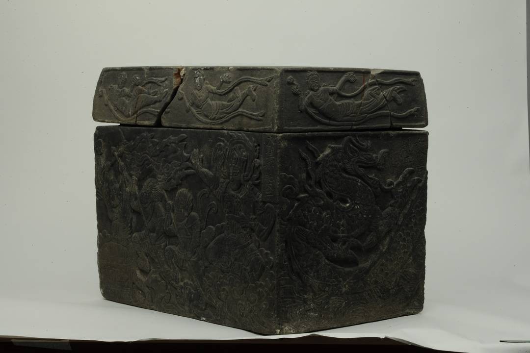 在这件石函所呈现的画面中可以看到,哪吒头戴火焰冠,身著甲衣,脚踏祥云,左手托佛舍利塔,右手作指挥之势。夜叉或摇旗呐喊,或击鼓助威,或举剑劈杀,或张弓射箭,战斗场面紧张激烈。此外,还有龙王长躯疾飞,回首张口,惊慌逃窜中后脚已中一箭,另一支箭正飞向其腹部,八只有首无身的小龙紧随其后。