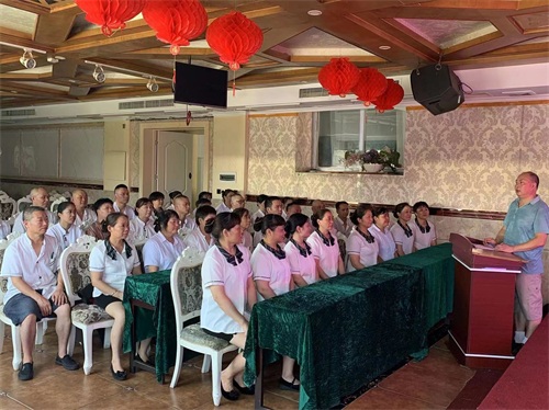 五福大酒楼老板李友胜主持召开员工大会