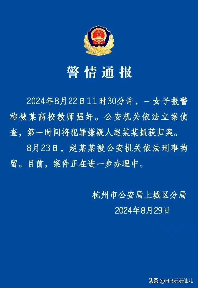 针对网传中国美术学院(以下简称中国美院)教授赵爱民涉嫌酒后强奸女研究生一事,8月29日晚,杭州市公安局上城区分局发布警情通报属实!通报称,8月22日11时30分许,一女生报警称被某高校教师强奸,公安机关第一时间将犯罪嫌疑人赵某某抓获归案。通报还称,8月23日,赵某某被公安机关依法刑事拘留。