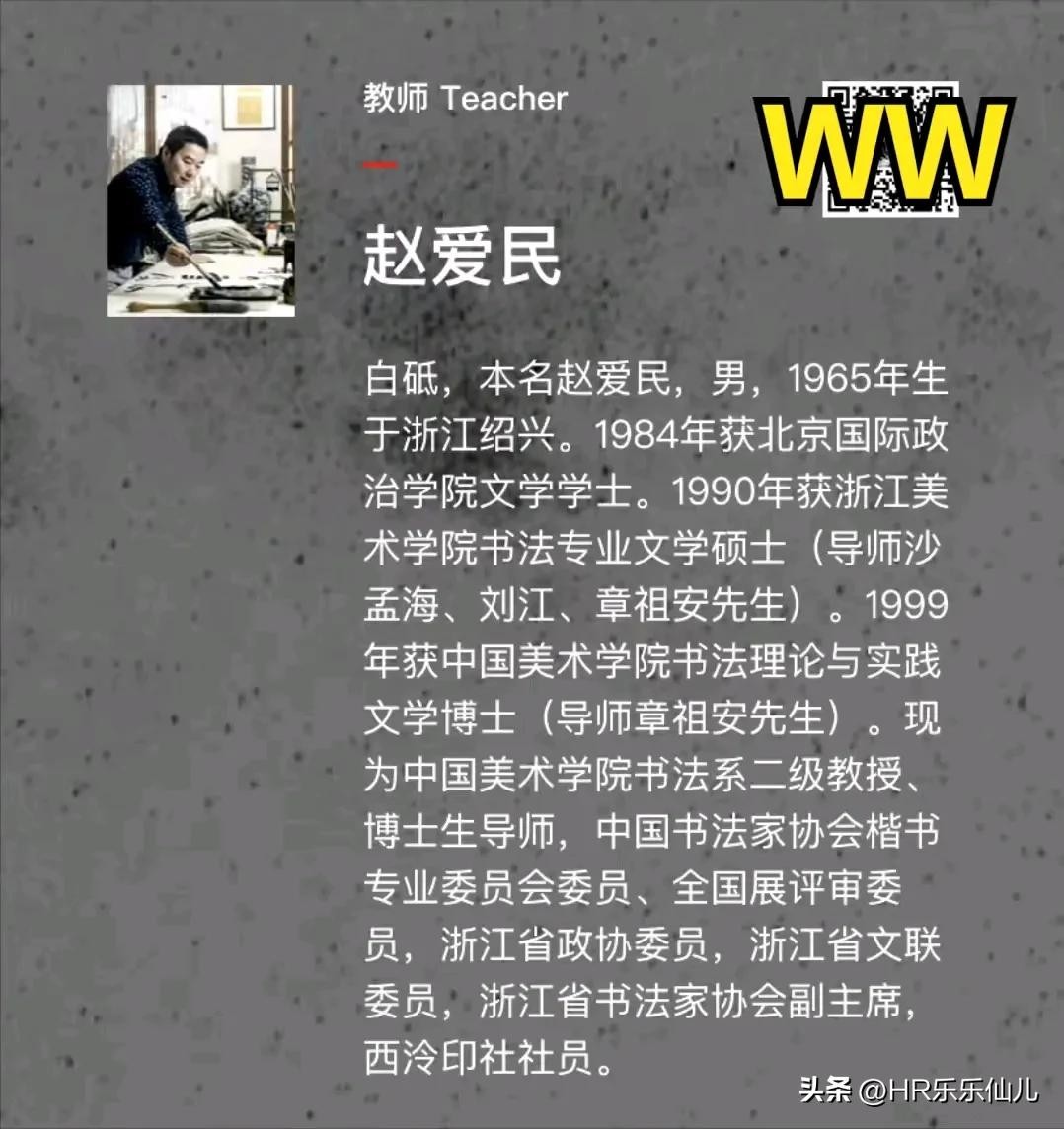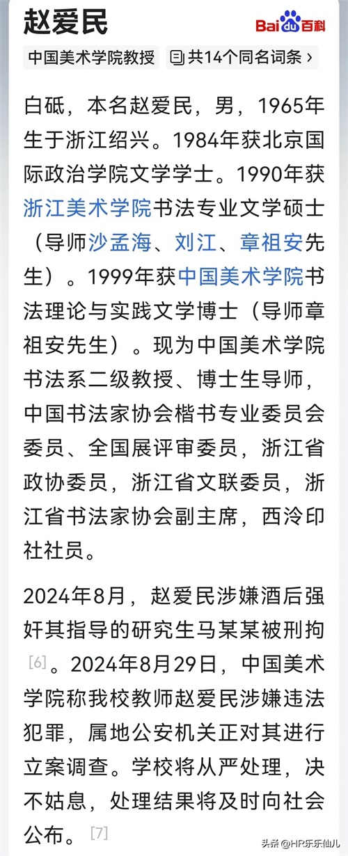 另据百度百科证实,赵某某为中国美院教授赵爱民,笔名为白砥。其重量身份及“名言”也被圈内知情人“扒”了出来。更为讽刺的是,网传信息的8月26日当天,某书法圈内公众号全文刊登了白砥和其42位博士和硕士研究生集体举办书法作品展览情况和白砥现场讲座的报道。