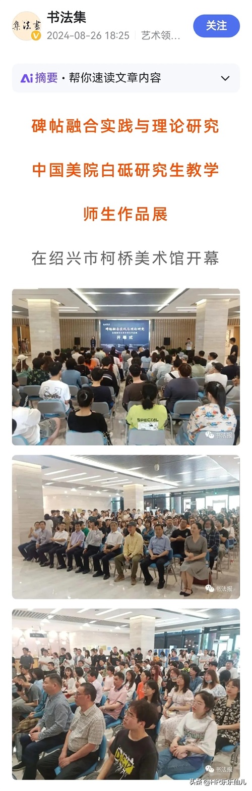 更为讽刺的是,被网友举报的8月26日当天,《书法集》以《碑帖融合实践与理论研究》为题,报道了中国美院白砥研究生教学师生作品展在浙江绍兴市柯桥美术馆开幕的消息。该报道称,本次展览汇集了省内外,白砥老师的42位硕士博士研究生,共展出作品70余件,展览同时还举行了《碑帖融合的历史价值与意义》学术讲座,而道貌岸然的赵爱民正是主讲人。