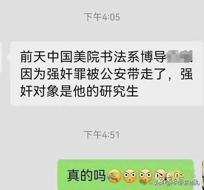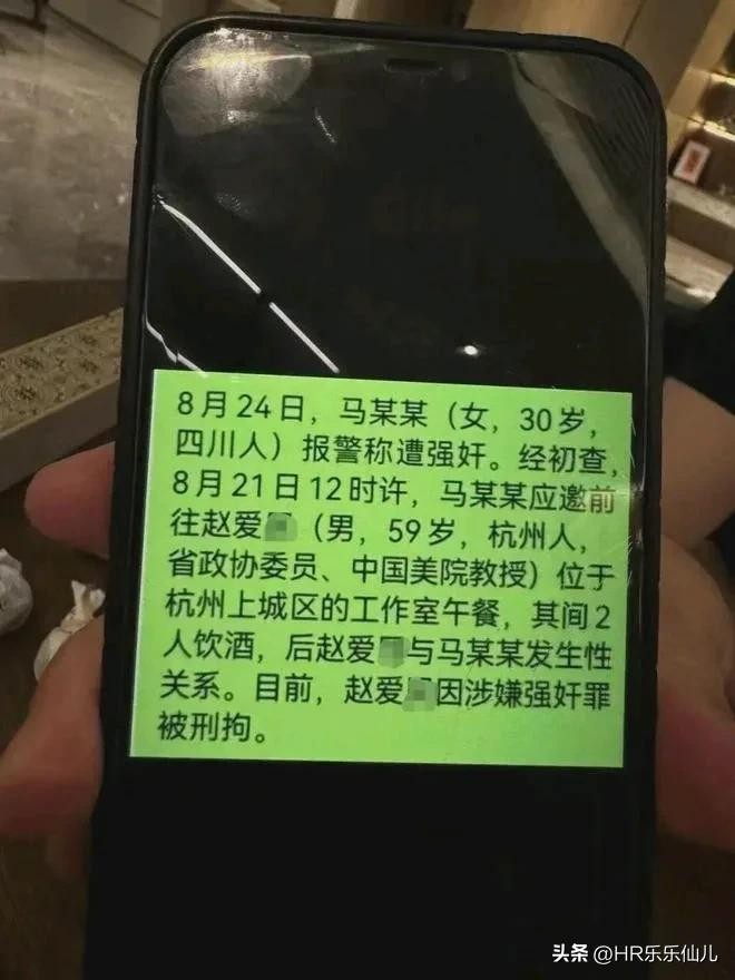 据奔流新闻报道,8月26日,网传多张聊天记录内容显示,“中国美术学院教授赵爱民因为涉嫌强奸被公安带走了,强奸对象是他的研究生!”另有聊天记录补充道:“听说进局子了,还有证据”,“事发8月21日12时许,马某某应邀前往赵爱民位于杭州上城区的工作室午餐,其间两人饮酒后,赵爱民与马某某发生性关系。其后,马某某报警称遭遇赵爱民强奸,赵爱民被警方带走。”随后,记者分别采访杭州警方和中国美术学院党办,均表示不方便透露或不知情。直至杭州警方警方正式通报实锤!