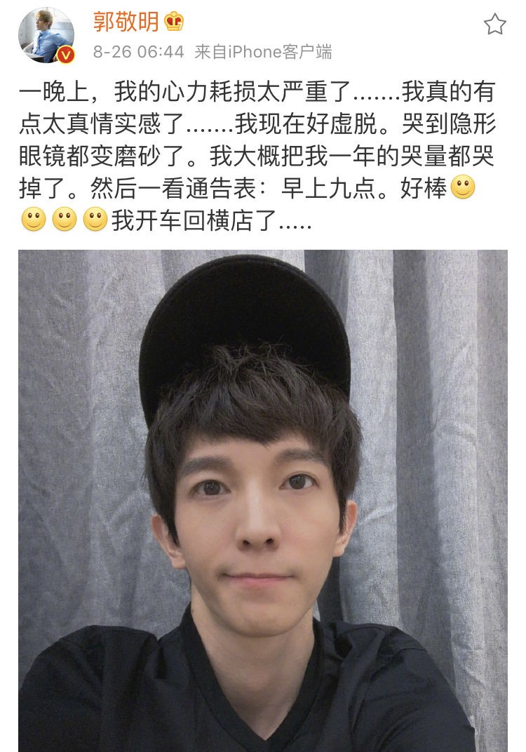 8月26日早间,郭敬明使出一张自拍照,并发文表露自己一晚上没睡,而由于当晚哭的太厉害就连自己的隐形银镜都变成了磨砂,而爆哭缘由究竟如何再次让网友热议纷纷,不过并没有好好休息的郭敬明再次启程赶往下个工作!