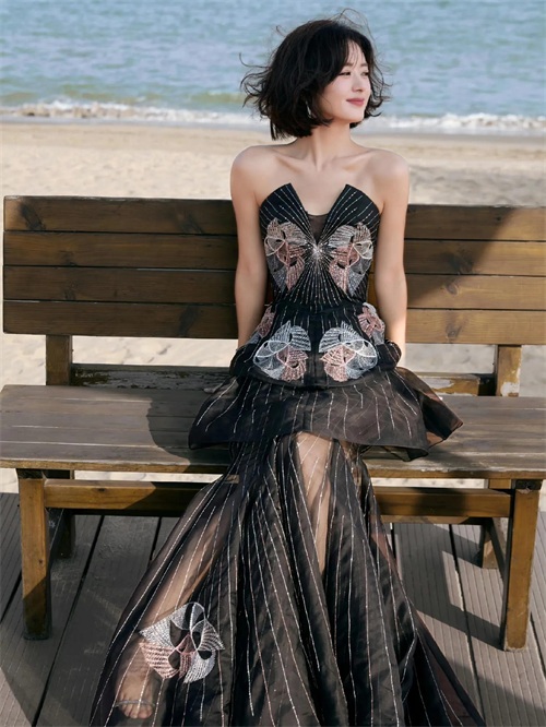 黑色的抹胸纱裙,白色的条纹设计,还有红和黑的刺绣,高贵优雅又充满神秘感!